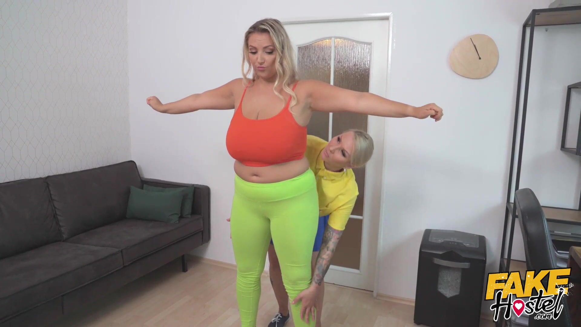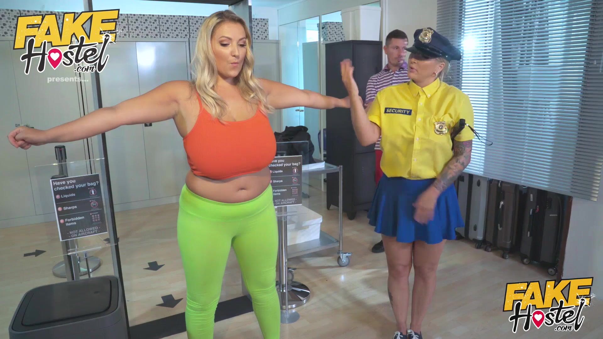 Fake Hostel - Big busty blonde cheating wife gets searched by horny BBW airport security when she finds a bottle of lube in her ass and then needs to get some lesbian boobs action before giving her an orgasm so instense she squirts on a window