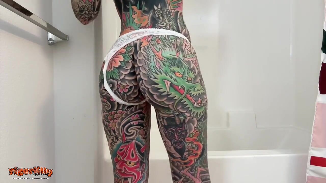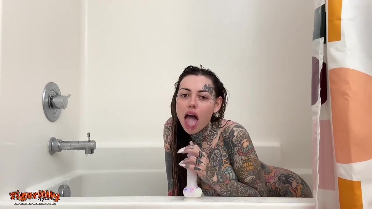 Tattooed MILF with big tits & split tongue masturbating in shower until she squirts