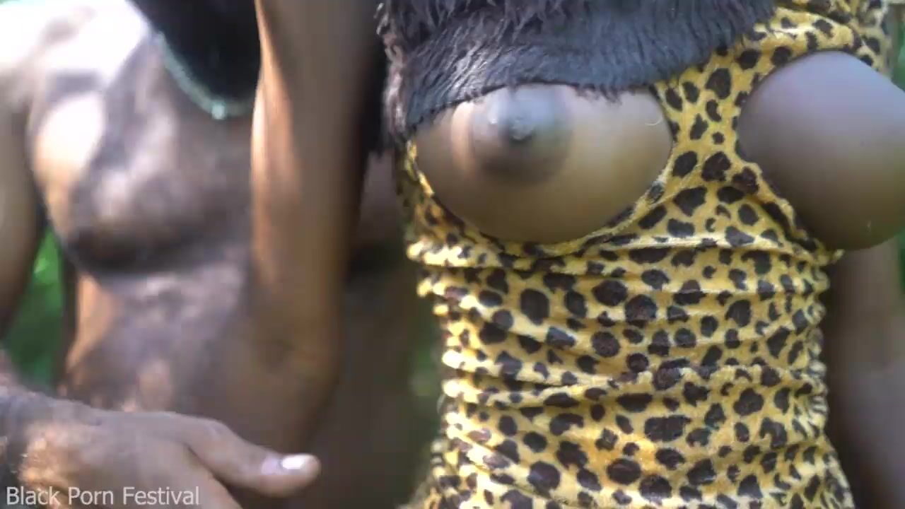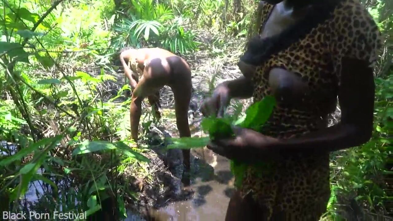 2 African tribe girl having fun with the village chief in the middle of the forrest