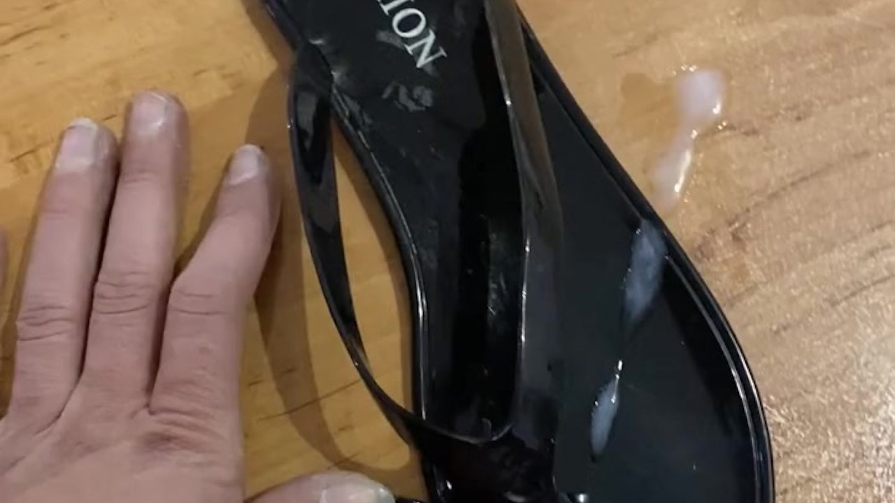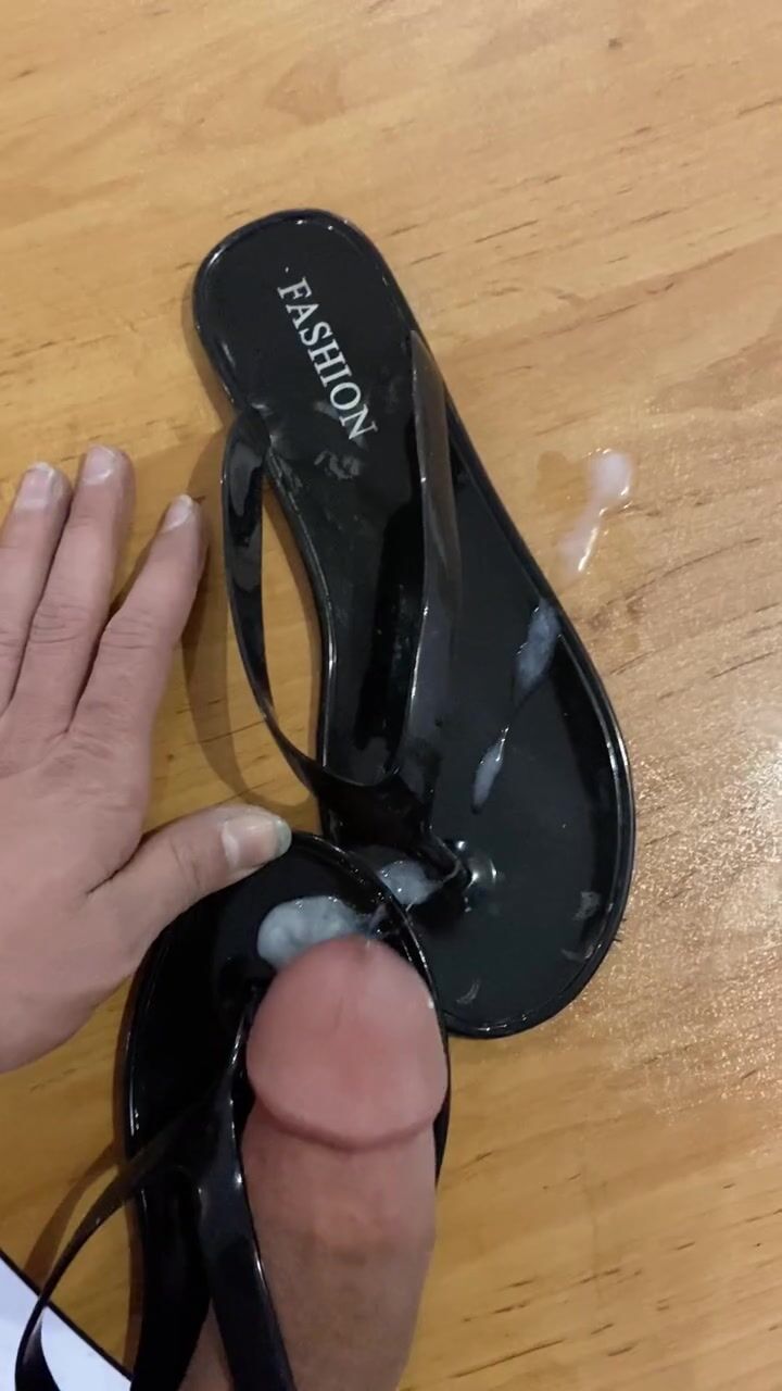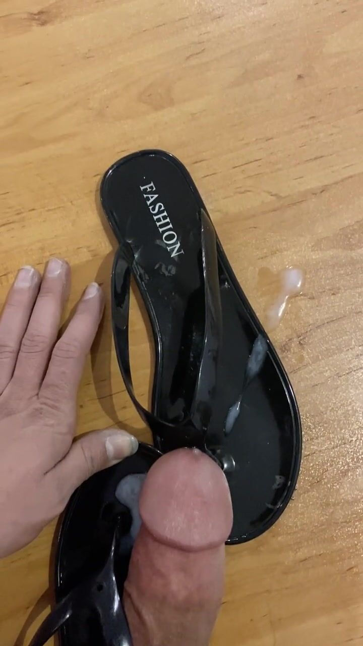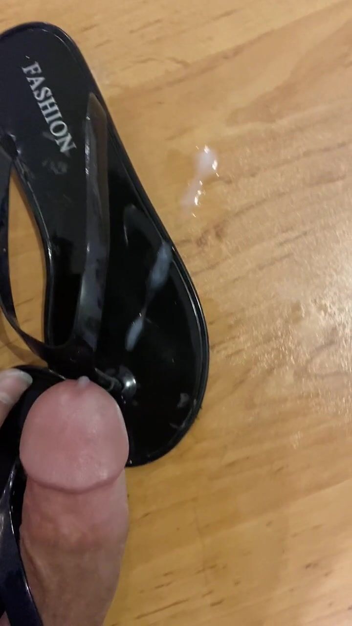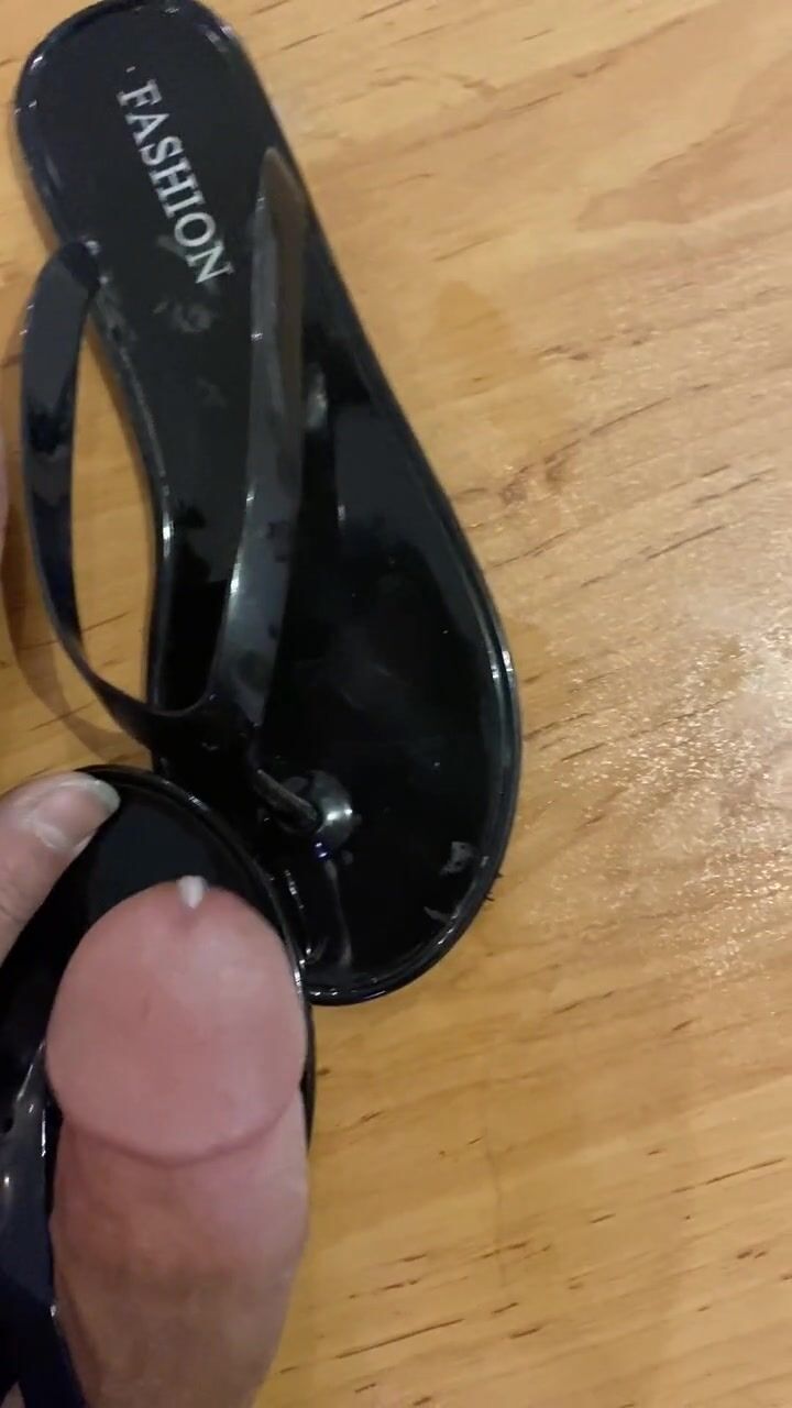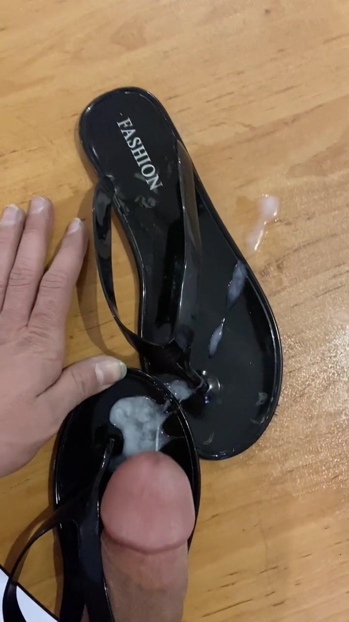 Screw Shiny Ebony Flip Flop and Cum in Sandal
