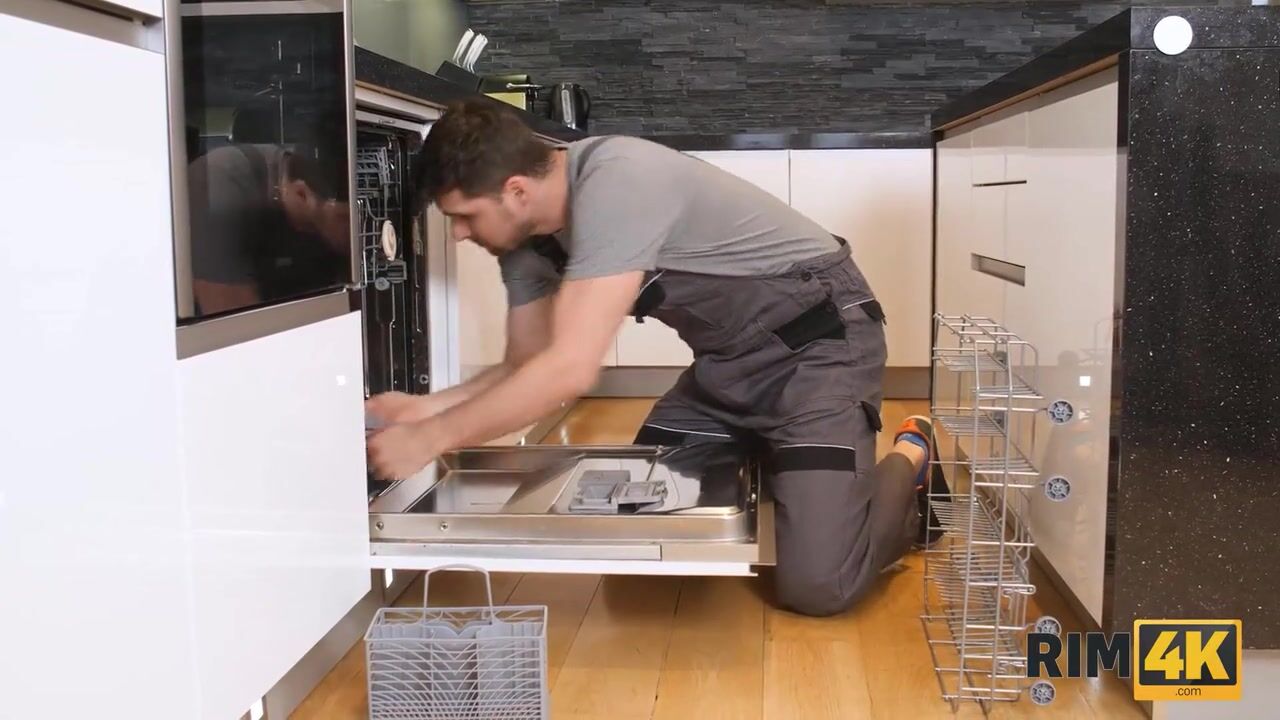 RIM4K. Gal interrupts repairer and begins licking his butt by the dishwasher