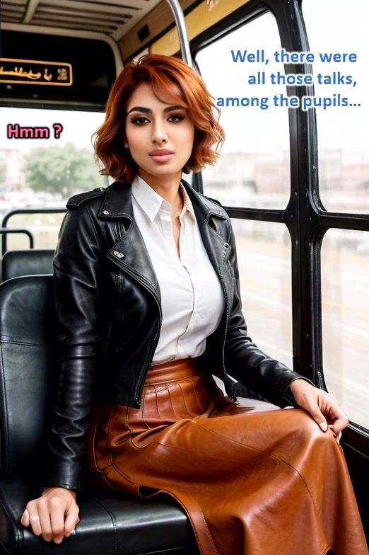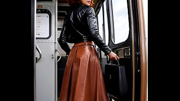 Breasty older redhead in full leather doing pole dance in a bus - AI Illustrated leather porn fantasy