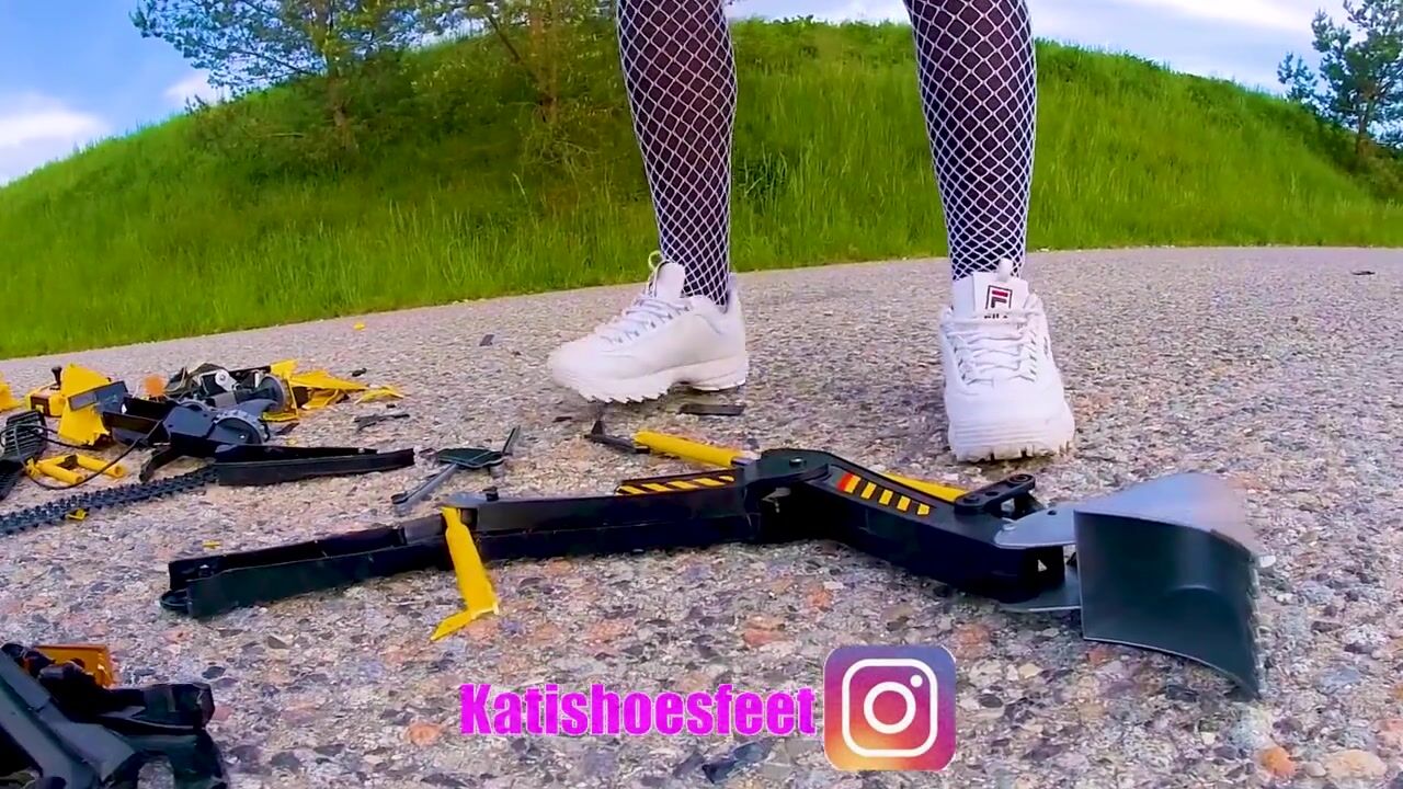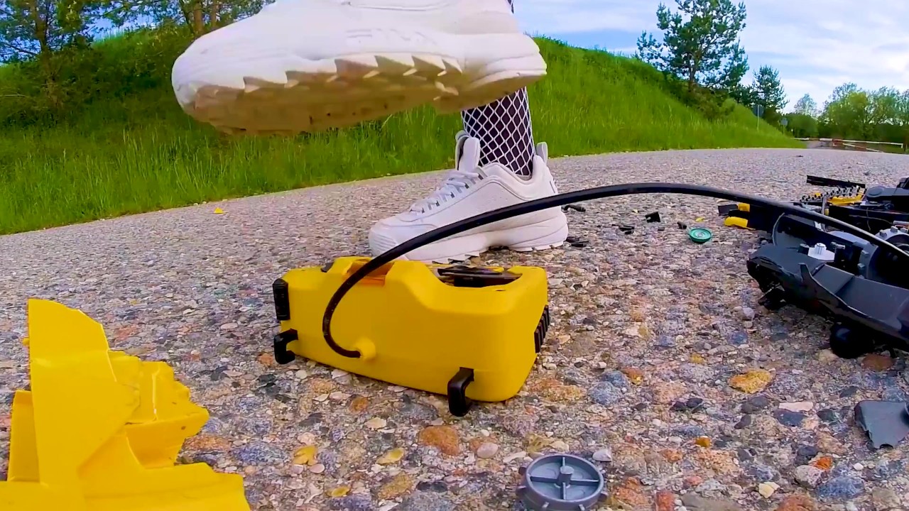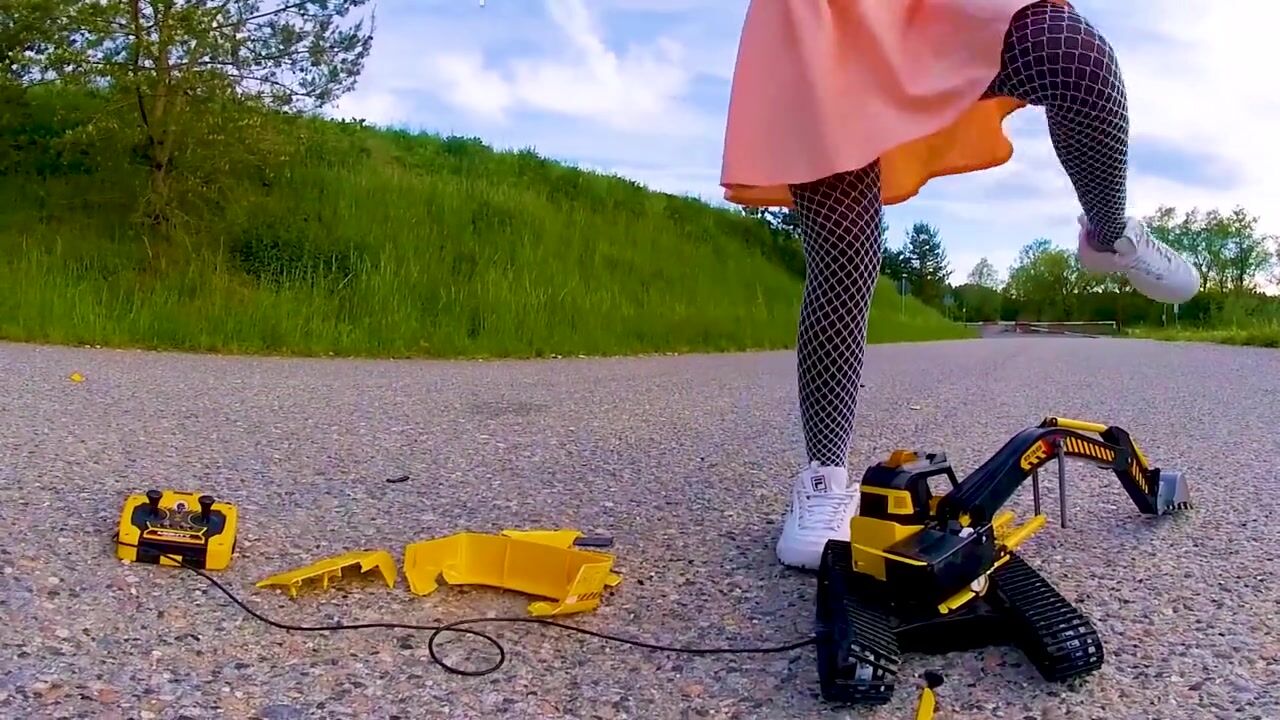 Large excavator is destroyed kicked, trampled, crushed, smashed, crushed, broken plastic car, crush