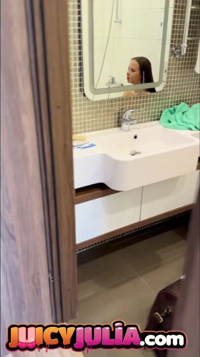 Soaked Julia peeing in baths and showing her large melons