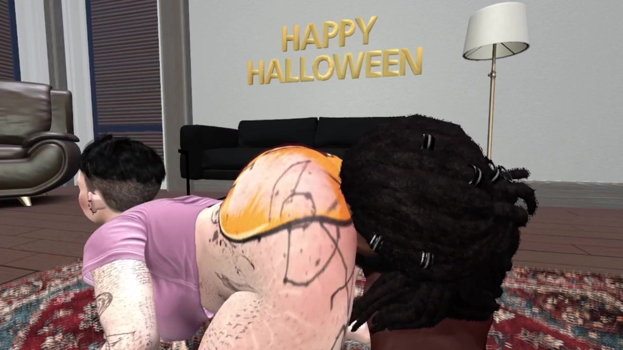 Second Life Ebony dude bangs white woman at a halloween abode party halloween particular