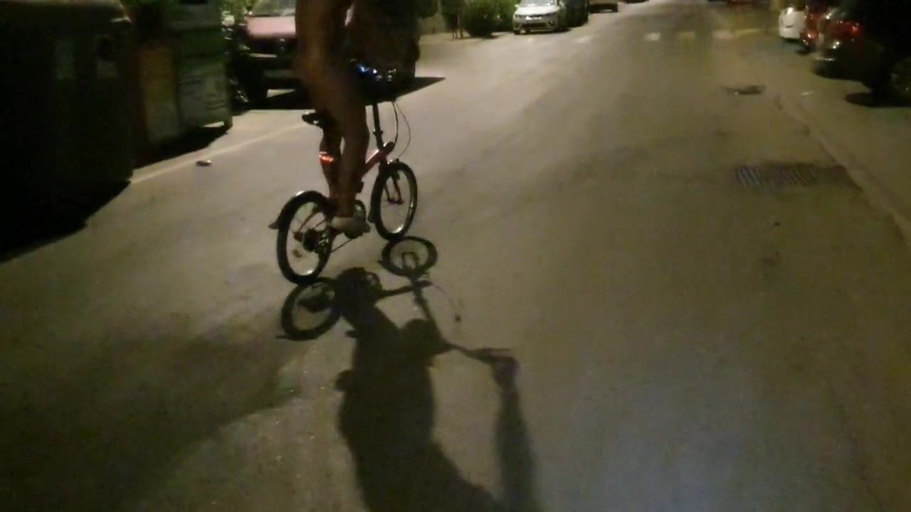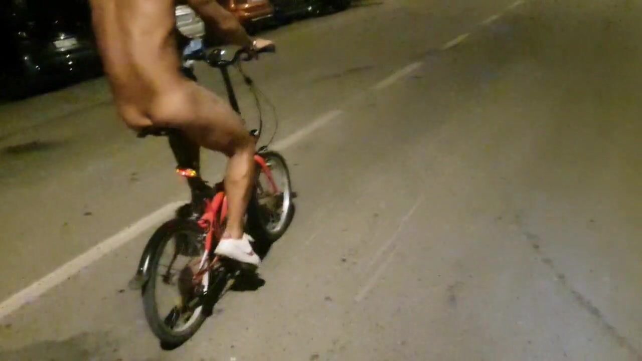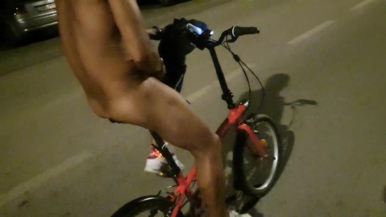 Hot chap disrobes on a public street and rides a bike nude touching his weenie - risky