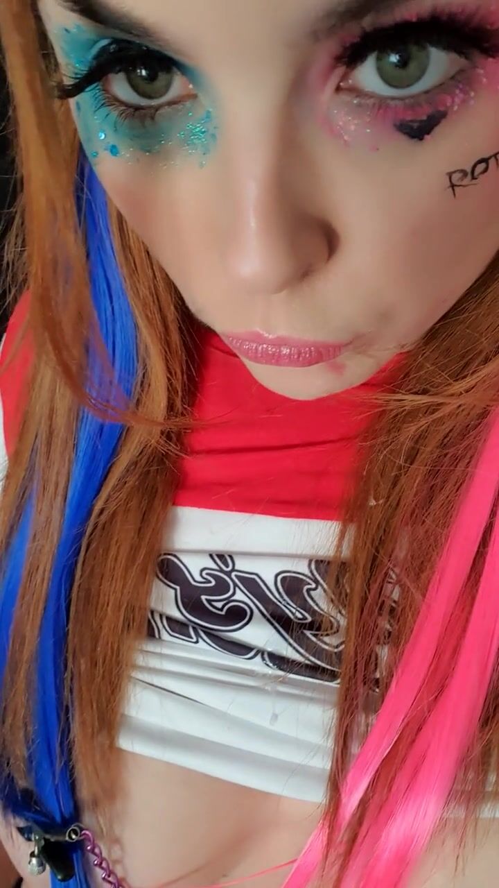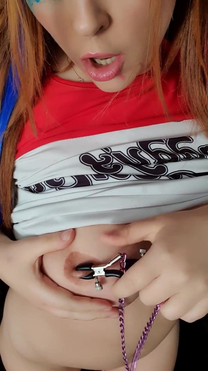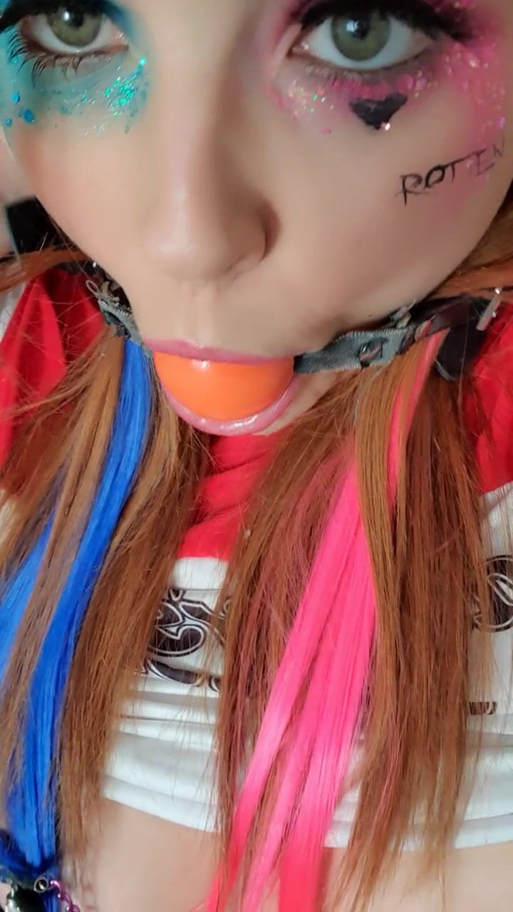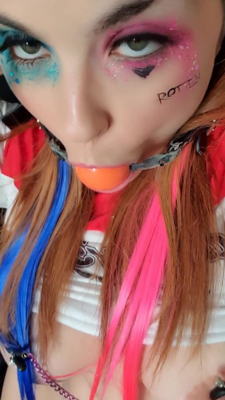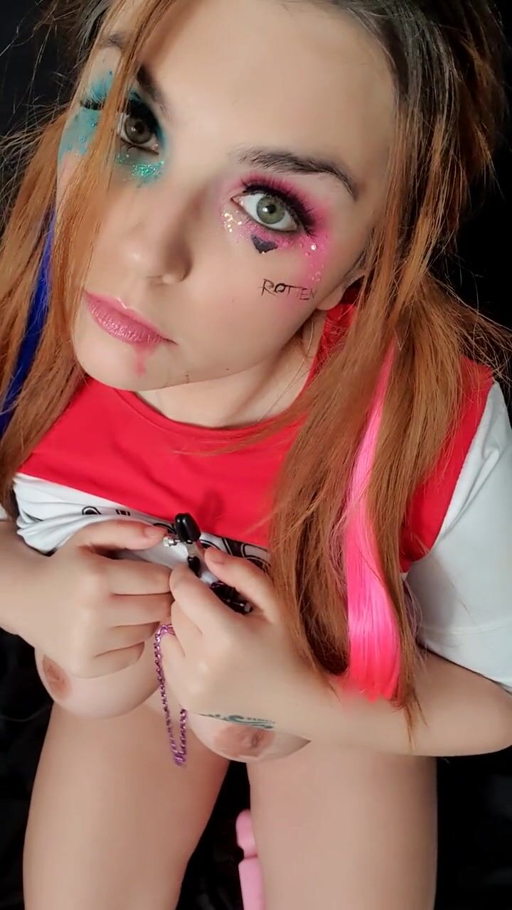 Harley Quinn cosplay gagged drooling saliva nipp clamps