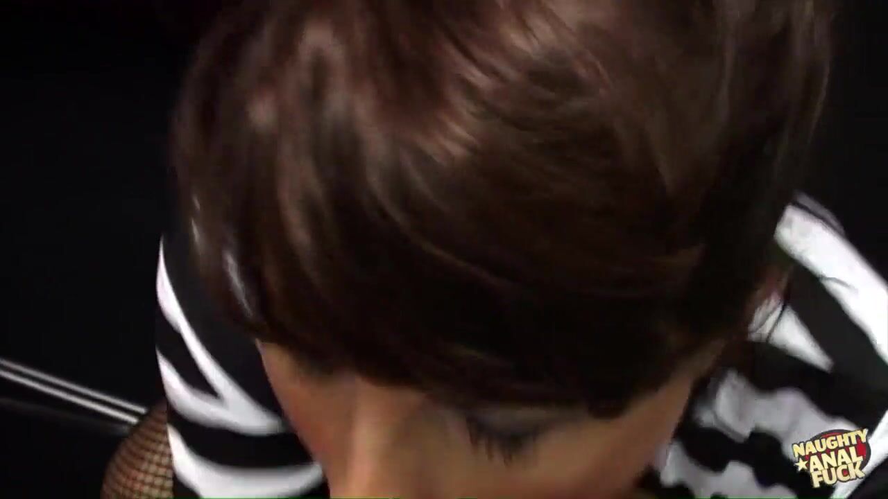 A brunette hair escapes from jail and engages in booty-ramming with a big rod at a pub.