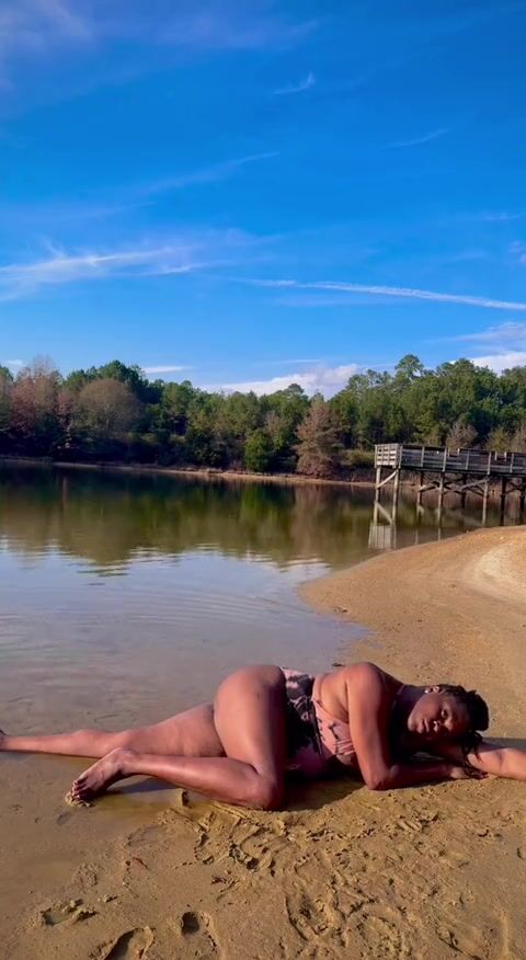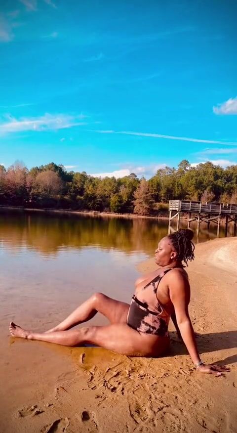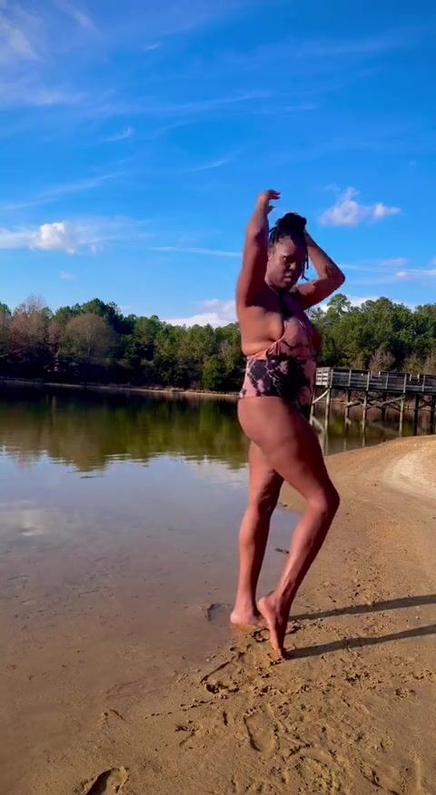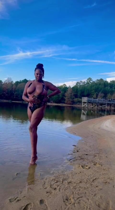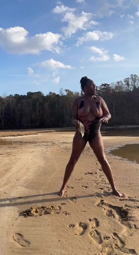 BLACK COUGAR TWERKING ON THE BEACH IN A SWIMSUIT