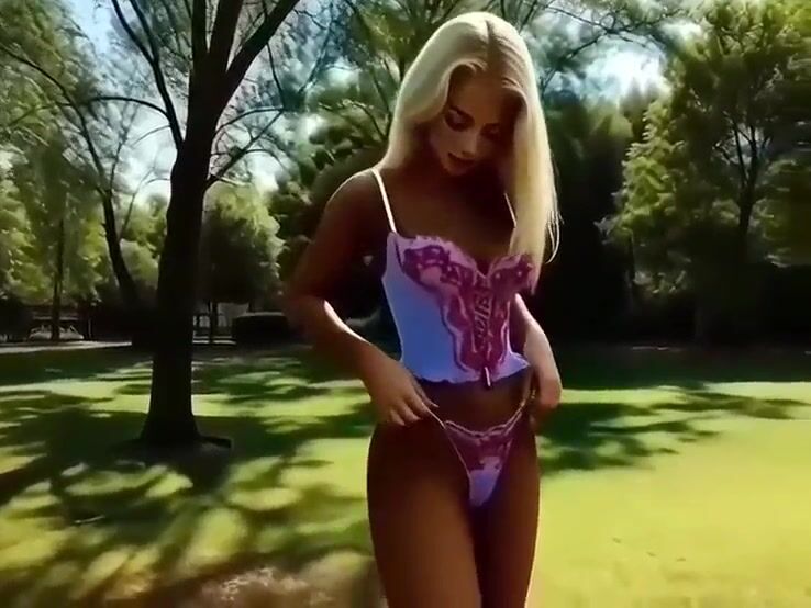 Blonde hotty walks undressed in the park, bangs and masturbates, AI-generated