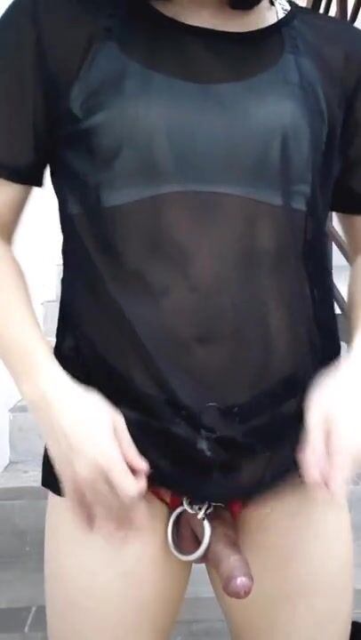 Crossdresser masturbating publicly on stairs