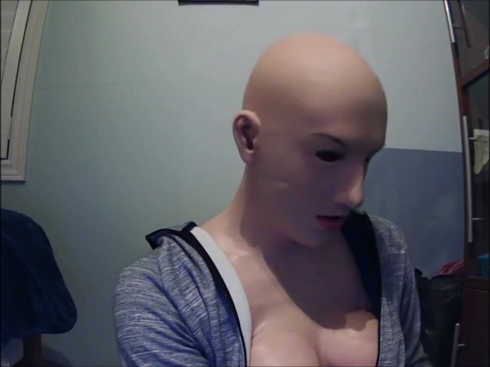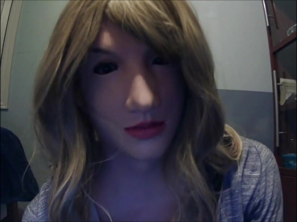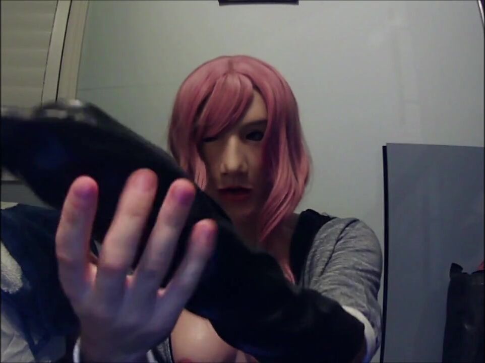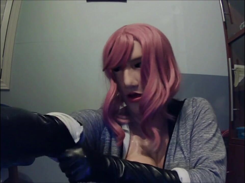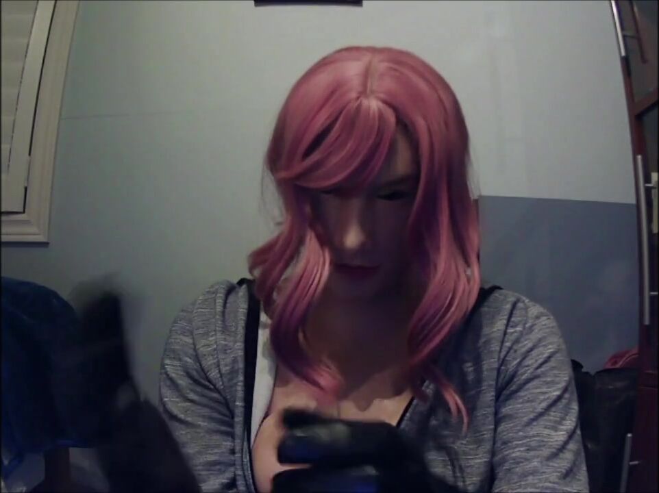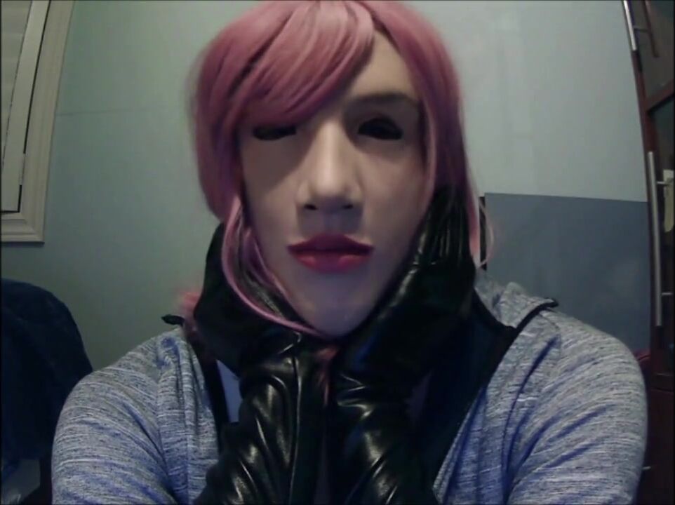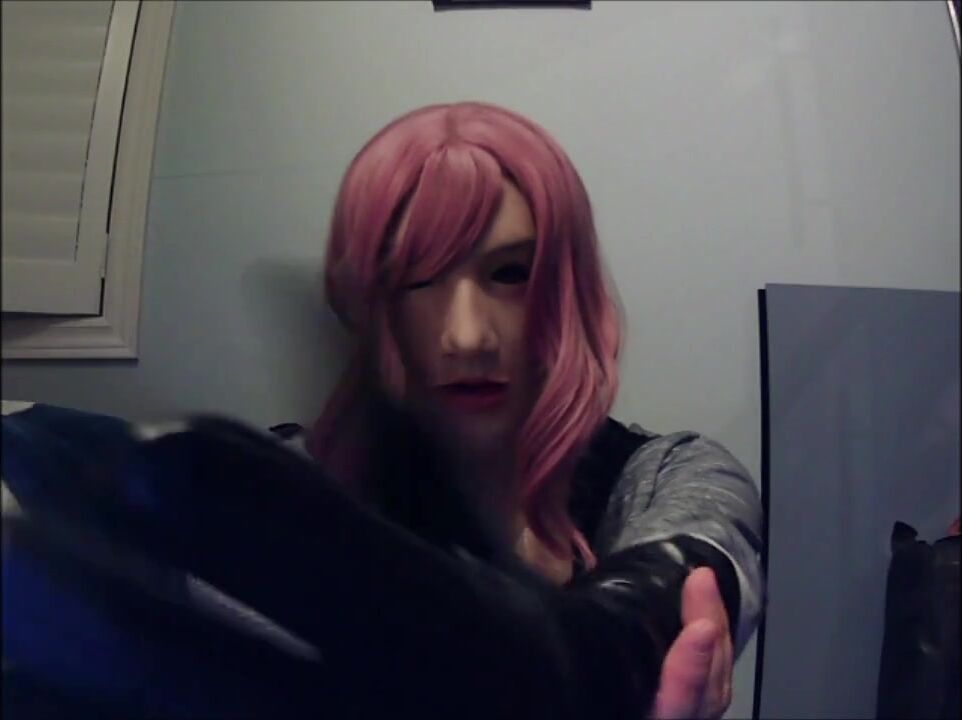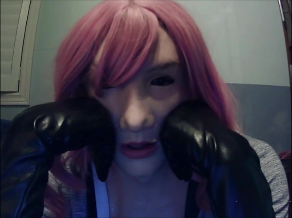 Masked in Anine female mask with pink wig and putting on ebony leather gloves!