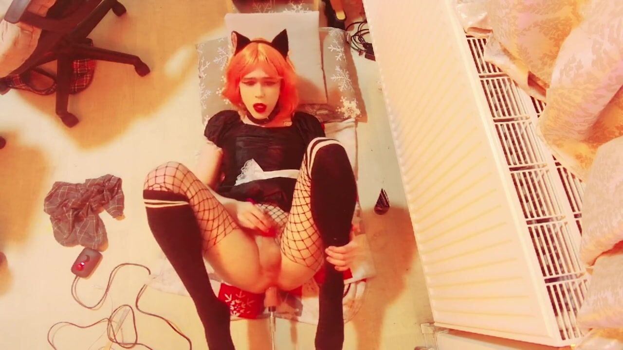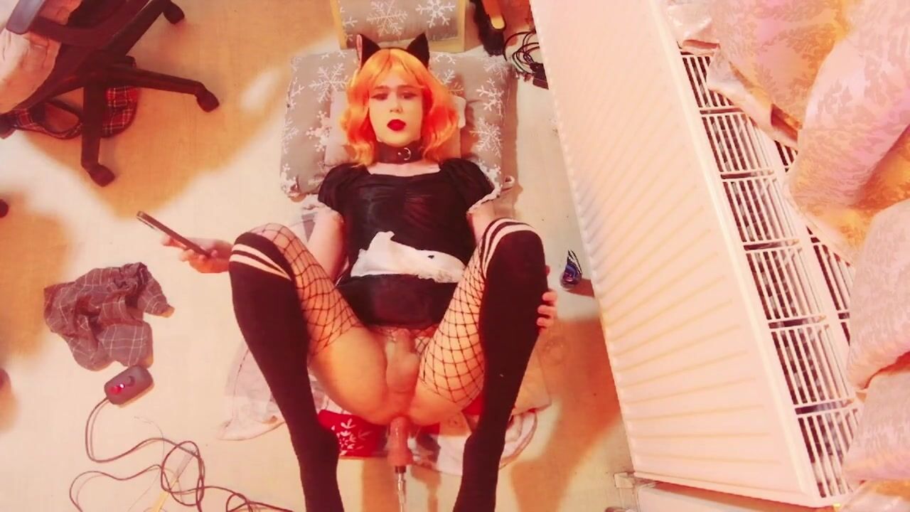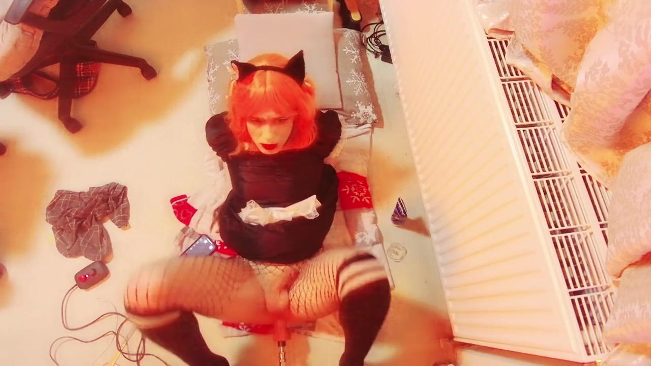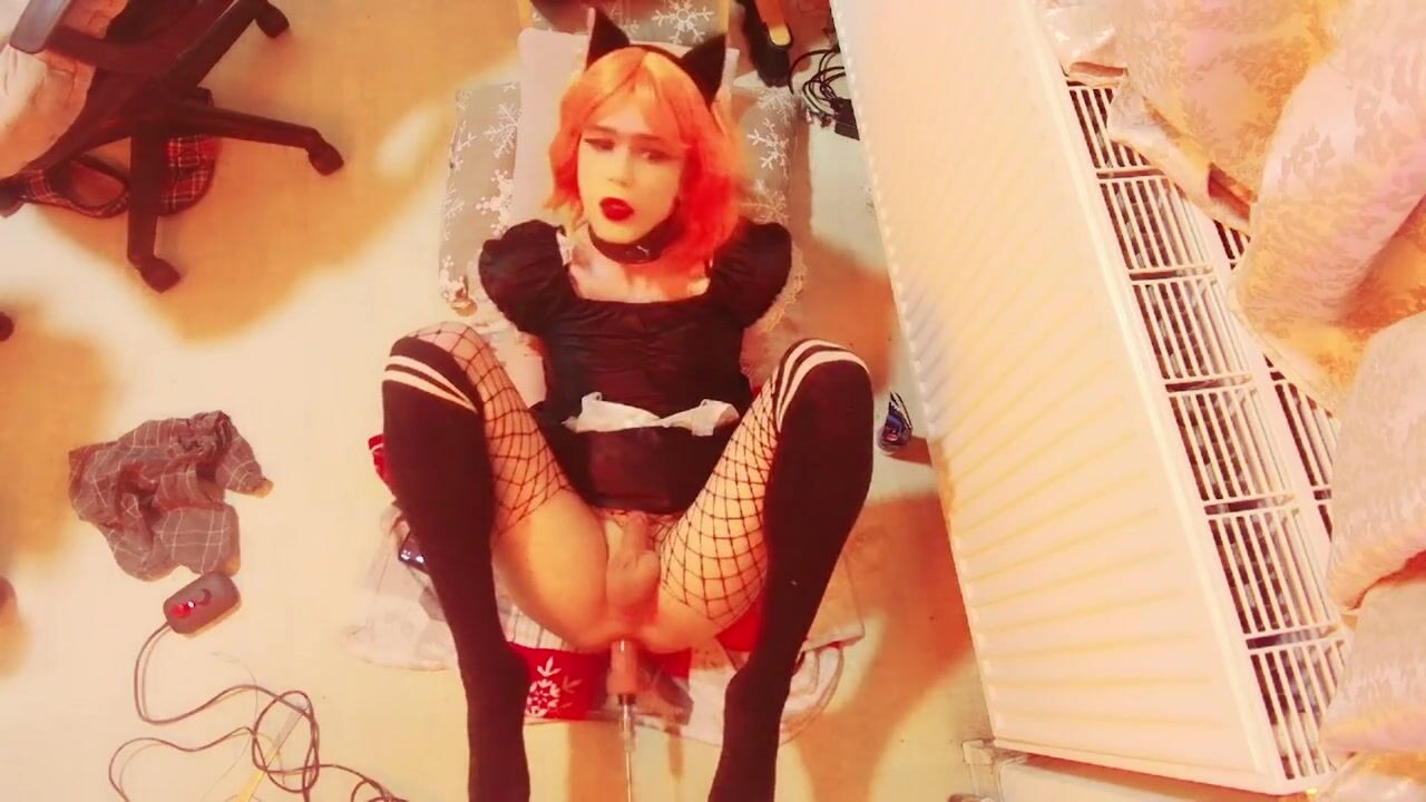 Trans maid cums after using bang machine